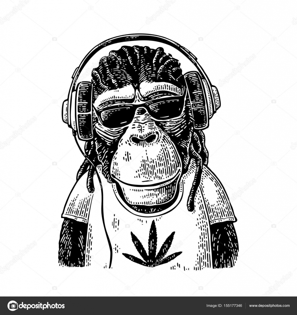 Monkey Hipster With Dreadlocks In Headphones Sunglasses And T